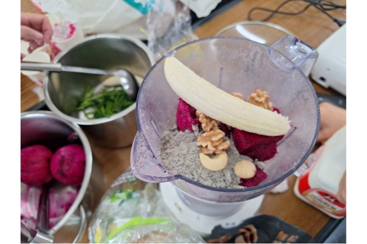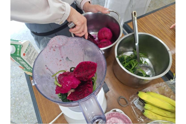 她們更是用心的準備了地瓜葉、堅果、芝麻粉、火龍果、香蕉、牛奶、豆漿